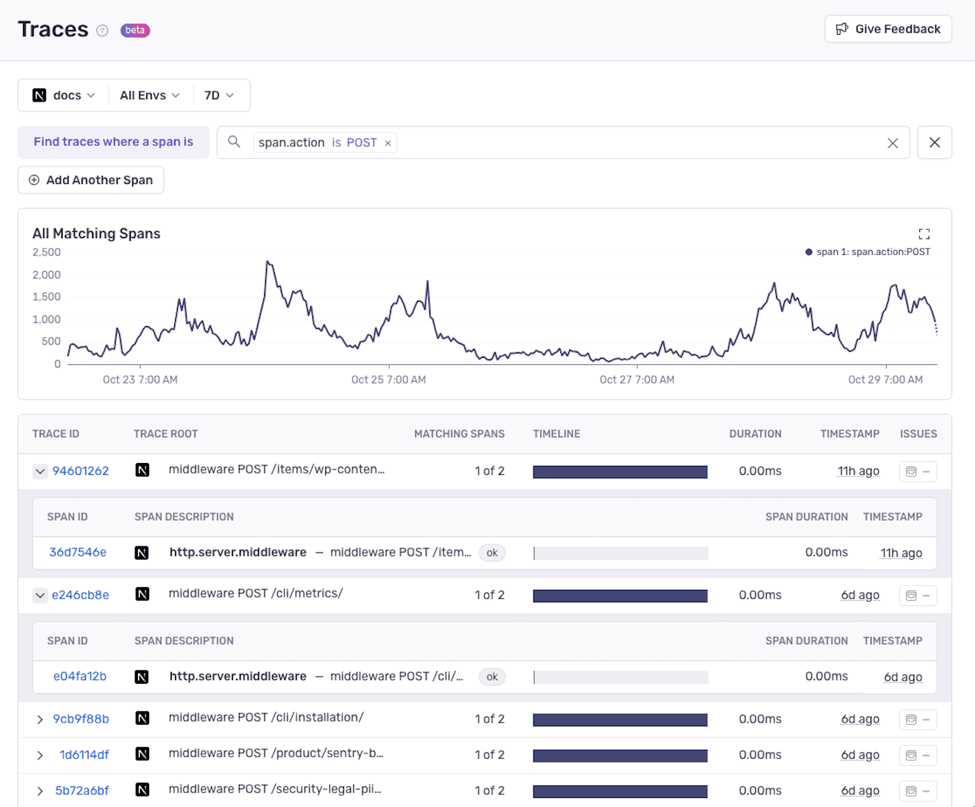 You can view all the traces in your organization by going to the Traces page in Sentry. You'll see a chart and a list of traces letting you know how long each trace took to complete and the number of spans it contains.