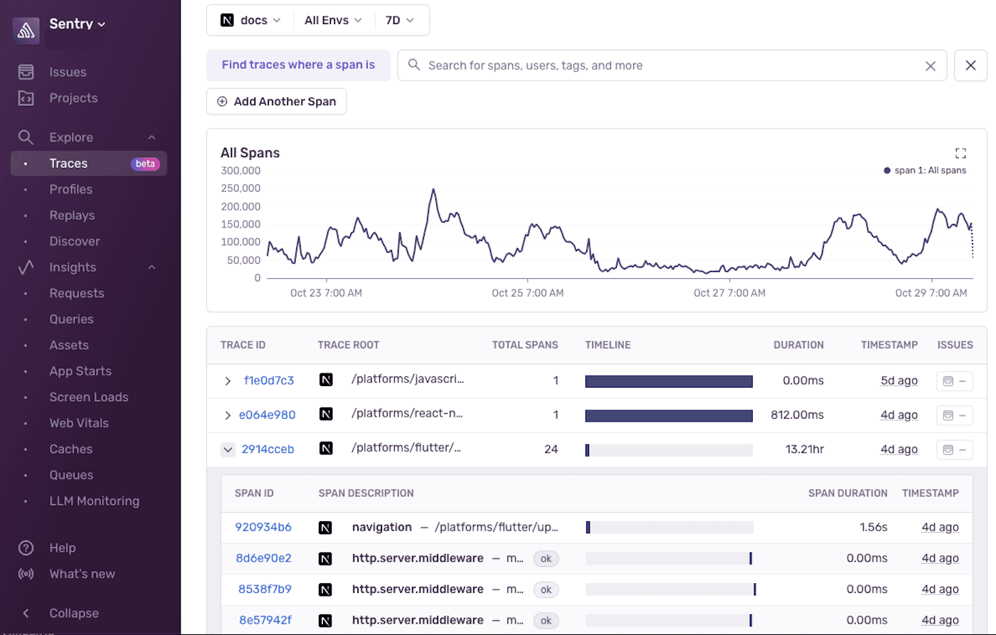 Alternatively, you can use the search bar to look for spans by name, project, or other criteria. You can also use the tags section to filter spans by specific tags. Learn more about the Sentry Trace Explorer.